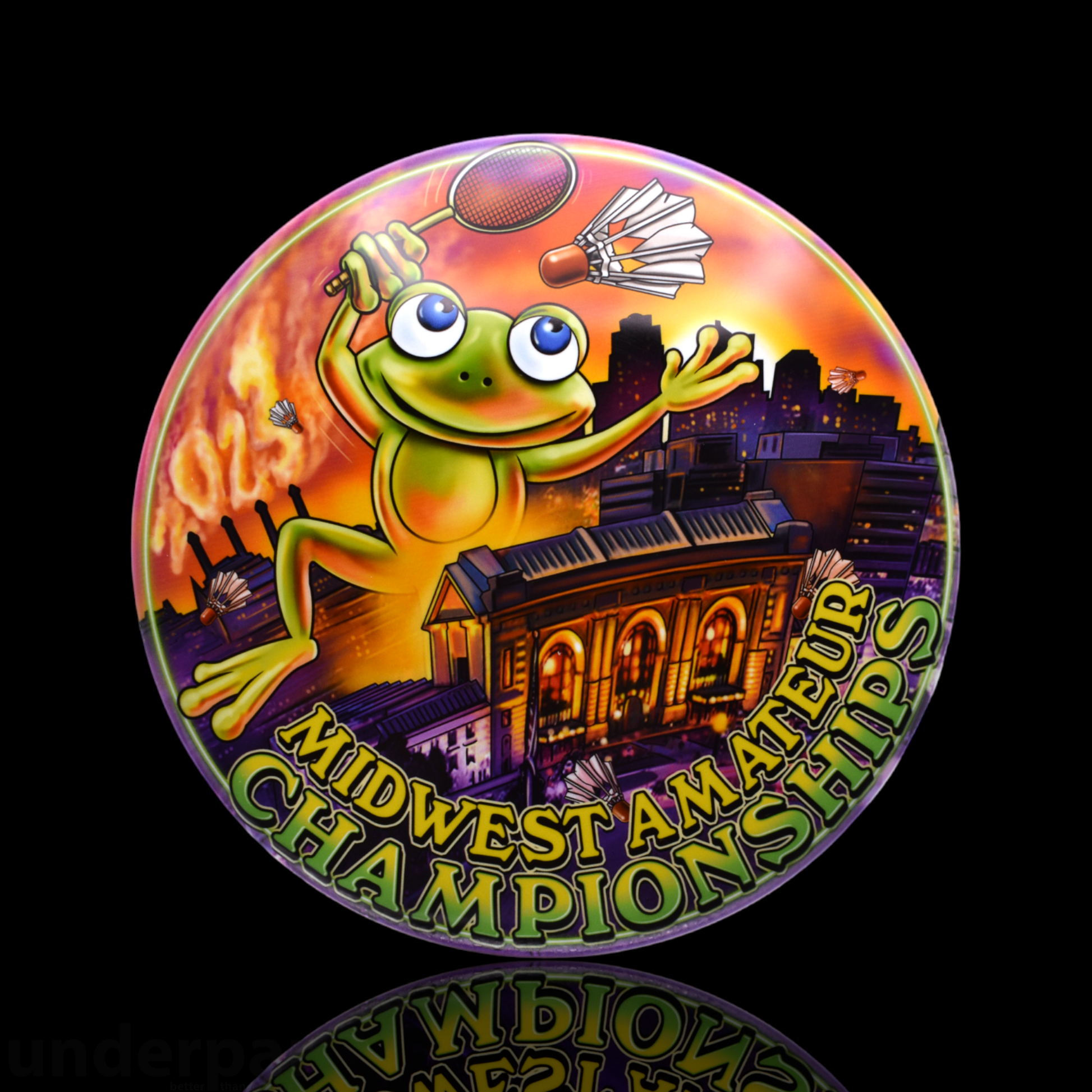 Collaborating with renowned artist Michael Barnard has once again produced an extraordinary design for the 2023 Midwest Amateur Championships PDGA A Tier in Kansas City. The captivating imagery features the UnderPar Frog engaging in a game of badminton against the backdrop of the iconic Kansas City Skyline, with prominent landmarks defining the city's silhouette.